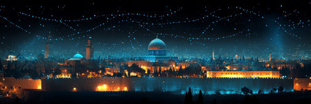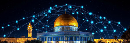 Dome of the Rock, Jerusalem, Illuminated at Night with a Technological Network Overlay
