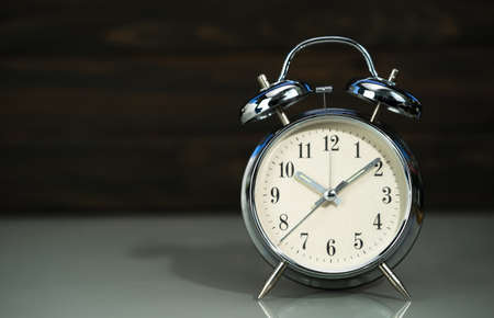 Vintage alarm clock on wood table.
