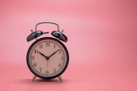 closeup of beautiful black alarm clock on pink background wit copy space.