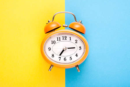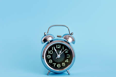 Colorful vintage style analog alarm clock on blue background with free copy paste space for text