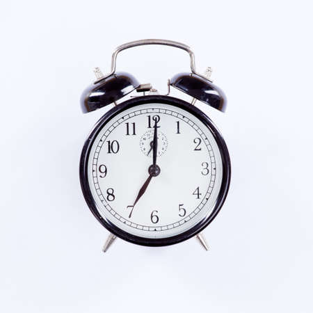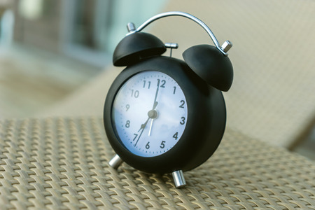 round white alarm clock on the table. Time seven in the morning, get up early, change hours