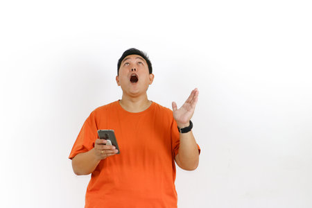 Amazed Asian man in orange t-shirt holding smartphone reacts with open mouth and raised hand, expressing total shock.