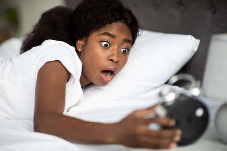 Woman hold big black clock on bed in bedroom at home. She shock after wake up too late for appointment or work or class study.