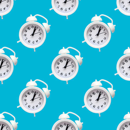 Seamless pattern of white alarm clock on colorful background. Trendy minimal style. Beauty and fashion concept. Flat lay composition. Top view