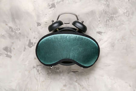 Alarm clock and sleeping mask on light background