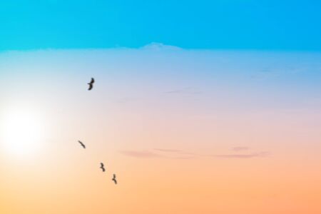 Flying seagull on the clear sky at sunset. freedom theme.