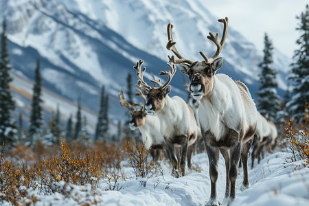 a stunning photo of canadian caribou in the midst of a bokeh-filled background. the overcast weather provides perfect lighting for this shot. capture all the intricate details of these majestic creatures with a high resolution of at least 32k. ai generated