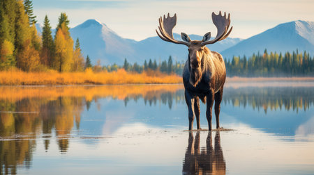 Bull Moose in Jasper National Park, Alberta, Canada. The animal is reflected in the lake.