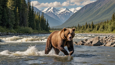 The Alaskan wilderness with a grizzly bear fishing in a rapid river, against a backdrop of pine forests and snow-capped mountains.