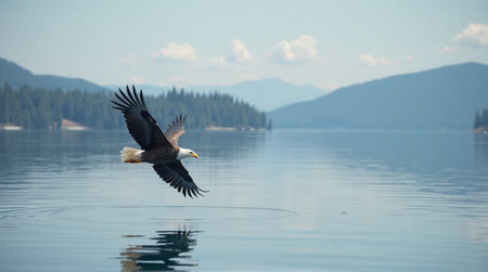 Majestic bald eagle soars powerfully over serene lake with mountains and forest backdrop in stunning flight