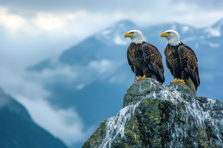 Two eagles are perched on a rock in front of a mountain