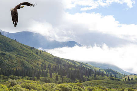 Digital image of bald eagle is flying through the air over mountains