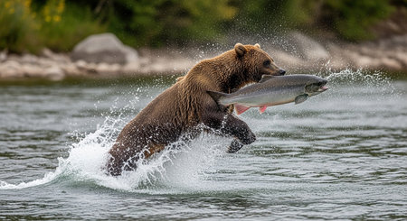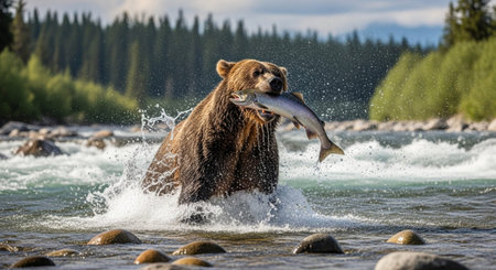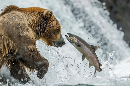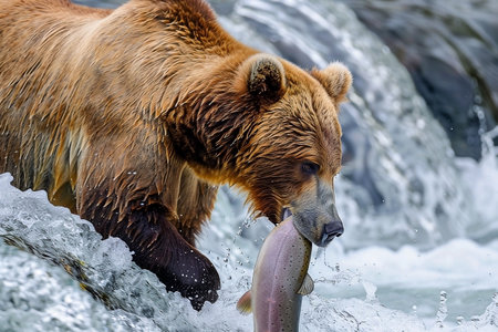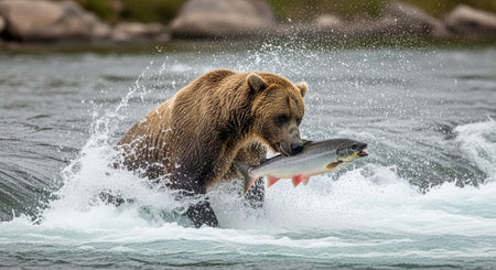 This stunning photograph captures a majestic brown bear in the midst of catching a salmon in the wild, icy waters of Alaska. The bear's powerful presence and determined gaze highlight its prowess as a top predator in this pristine natural habitat. The action-packed scene, with water splashing around the bear and the salmon trying to escape, offers a glimpse into the raw beauty and harsh realities of wildlife. Ideal for nature enthusiasts, wildlife photographers, and anyone seeking a dynamic representation of the natural world's untamed spirit. This image is perfect for educational content, wildlife documentaries, and environmental campaigns, emphasizing the importance of preserving such incredible ecosystems. Shot in a style reminiscent of National Geographic, this photo brings the wild into vivid focus, showcasing the bear's hunting skills and the salmon's struggle for survival in a single, breathtaking moment.
