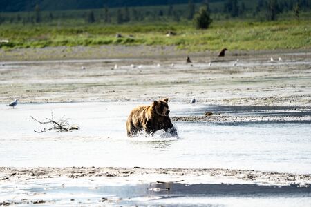 Alaskan Coastal Brown Bear grizzly searches for fish in a river in Katmai National Park, sitting on a sandbar