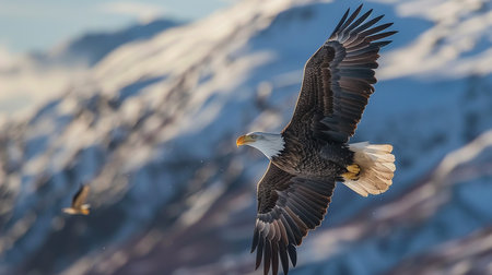 Bald eagle with outstretched wings flying gracefully above snow capped mountains under a dramatic cloudy sky. symbolizes freedom, power, and the wilderness.