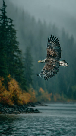 An eagle gracefully glides through the misty air above a calm river. Colorful autumn leaves hint at the changing season in the backdrop of towering trees and soft fog.