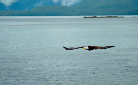 bald eagle flying over the sea in Ketchikan, Alaska. Bald eagle close up detail