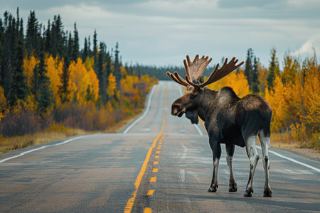 A big moose crossing road in autumn forested area. Danger of wild animals getting on the road Generative AI