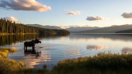 Moose on the lake at sunset in Jasper National Park, Alberta, Canada