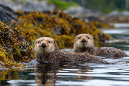 Two adorable sea otters are floating on their backs in a tranquil kelp forest bay, surrounded by vibrant kelp and calm waters, enjoying their serene habitat.