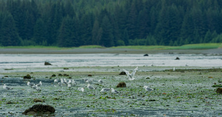 Seagulls rest on the river wetland and peck at the green seaweed. The fast-moving turquoise blue water of the river.Alaska, USA., 2017