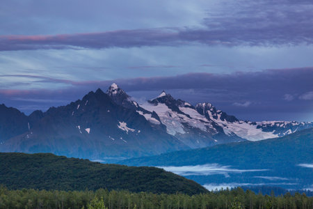 Picturesque Mountains of Alaska in summer. Snow covered massifs, glaciers and rocky peaks. Beautiful natural background.