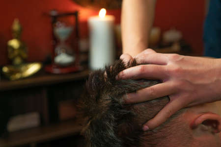Cranial osteopathy massage. Therapist massaging woman’s head.