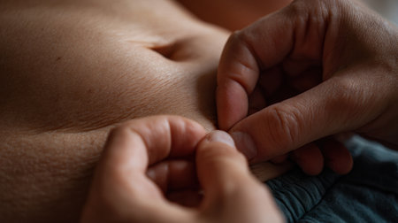 Hand gently squeezes belly skin, revealing macro detail of skin fold in a close-up medical setting focused on human anatomy.