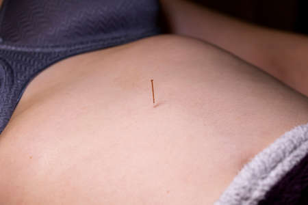 A portrait of a thin acupuncture needle between navel and sternum, put in place by an acupuncturist. This alternative medicine treatment is used for healing, relaxing, stimulation and stress relief.
