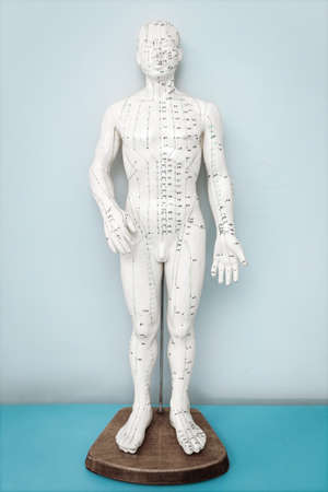 Almaty, Kazakhstan - July 12, 2021: Oriental Medicine model on hospital table, acupuncture chinese traditional medicine tutorial figure.