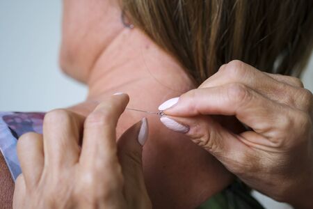 Acupuncture treatment with needles inserted to womans face and neck, closeup top view. Woman patient is lying on couch in hospital, clinic. Chinese alternative medicine in European world.