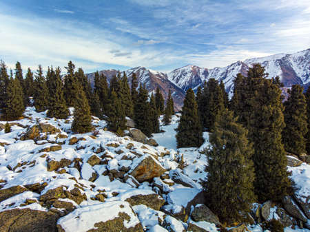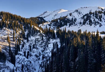 Beautiful morning in the winter mountains. Winter mountain landscape. Kazakhstan