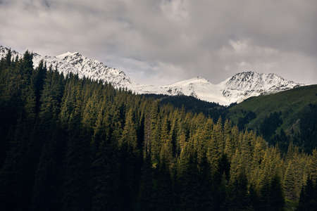Beautiful Tien shan peaks and mountains near Almaty. Dramatic overcast sky. Beauty world.
