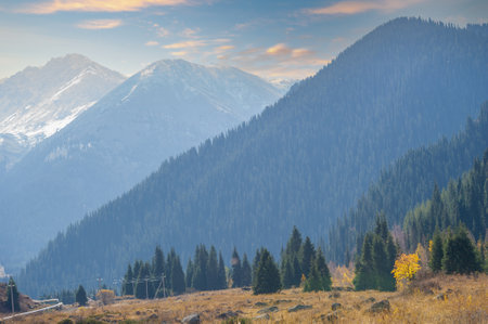 Landscape of beautiful summit in Tian Shan Mountains Valley at sunset in Almaty, Kazakhstan