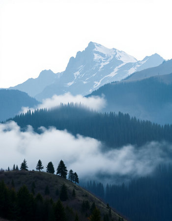 Mountain landscape with snow-capped peaks in the clouds.