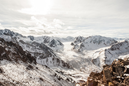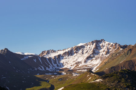 High snowy mountain Kumbel at Zaili Alatay range in Almaty, Kazakhstan