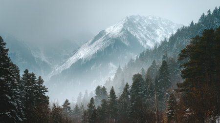 Mountain peak with snow and green forest at foggy cloudy day