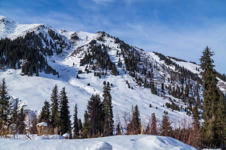 Winter Snowy Mountains valley with sun in Ak Bulak, Almaty, Kazakhstan, Asia