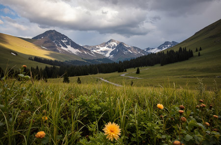 Panoramic view of the alpine meadows in the spring