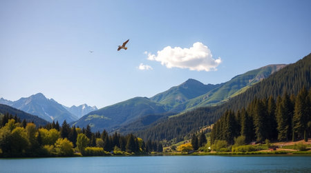 Lake in the mountains of Bavaria with a bird in the sky
