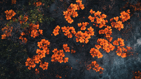 Top view of orange flowers blooming on the ground in the forest