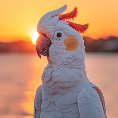 A white cockatoo showcases its stunning plumage against the backdrop of a twilight horizon with softly shimmering water. The sunset provides a warm glow, highlighting the bird's features..