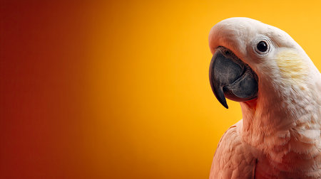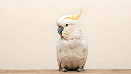 A close-up studio portrait of a white cockatoo parrot with a yellow crest. The bird looks sideways with a curious expression, set against a clean, minimalist beige background.