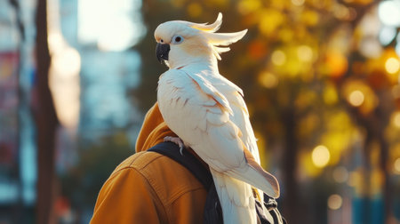 A cockatoo perched on a shoulder of a cheerful pet owner.
