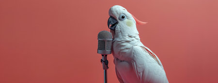 A white parrot is standing next to a microphone, possibly mimicking human speech or singing.