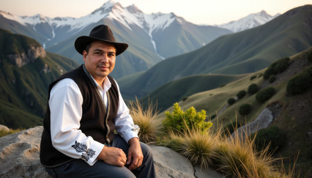 A Georgian man in a traditional hat, vest, and embroidered shirt sits on a rock, surrounded by lush greenery and majestic mountains.