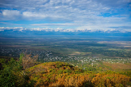 top view of Alazani valley in Georgia in springtime, in the distance through the haze visible to the Caucasus mountains