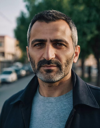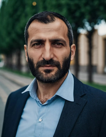 An Armenian man with a well-groomed beard and suit jacket gazes thoughtfully while standing on a bustling street surrounded by lush trees, embodying a strong presence.