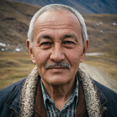 Against the breathtaking backdrop of Chukotka rugged terrain, a seasoned Chukchi man exudes wisdom, embodying the spirit of his people through a gentle smile and profound expressions.