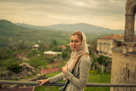 Young, beautiful girl posing in Gelati monastery mountains in the background